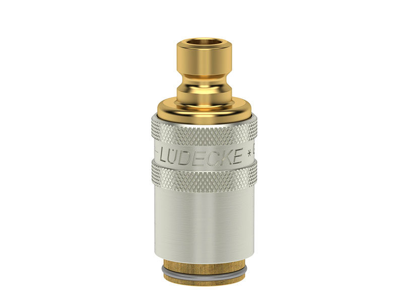 Adapter z gniazdem i wtykiem szybkozłączki, wykonany z mosiądzu (MS 58) niklowanego, z elementami ze stali szlachetnej i uszczelnieniem z gumy fluorowej (FKM).