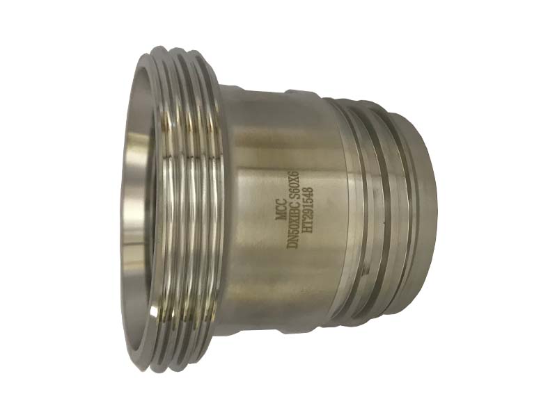 Adapter z męskim złączem mleczarskim DIN 11851 i złączem IBC z gwintem wewnętrznym, wykonany ze Stali Szlachetnej z uszczelką polietylenową w złączu IBC.