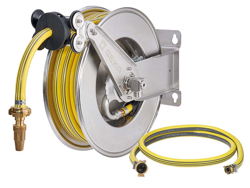 Automatyczne zwijadło naścienne wykonane ze stali szlachetnej, z wężem wielowarstwowym z tworzyw sztucznych z wkładkami z przędzy syntetycznej, oraz złączami kłowymi z mosiądzu.