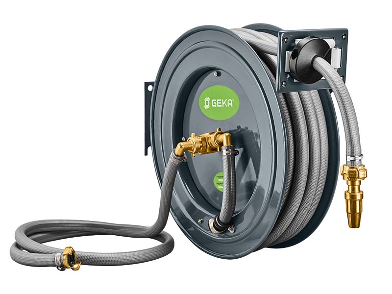 Automatyczne zwijadło naścienne wykonane ze stali malowanej proszkowo, z wężem z PVC z wkładkami z przędzy syntetycznej, oraz elementami wykonanymi ze stali szlachetnej i mosiądzu.