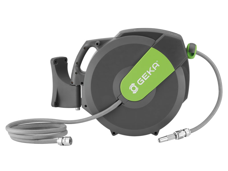 Zwijadła naścienne K15, produkcji KARASTO, są gotowymi do montażu urządzeniami do przesyłu wody do podlewania w ogrodach, ogródkach i zastosowaniach przydomowych. Doskonale sprawdzą się przy uprawach warzyw i owoców na działkach rekreacyjnych, w przydomowych garażach i ogródkach. Zwijadło posiada zamontowany wysokiej jakości wytrzymały wąż ogrodowy i wąż przyłączeniowy, wyposażony w system szybkozłączy ogrodowych GEKA PLUS Push-fit oraz dyszę do nawadnia. Wszystkie elementy niezbędne do montażu urządzenia znajdują się w zestawie, w tym również śruby i kołki do montażu na ścianie. Dzięki zwijadłu, w łatwy sposób porządkuje się przestrzeń w garażu, w warsztacie, czy przydomowym magazynku na narzędzia. Przewód za każdym razem, będzie automatycznie zwinięty, zajmując mniej przestrzeni, a wygodna obudowa, zabezpieczy go przed nieumyślnym uszkodzeniem.
