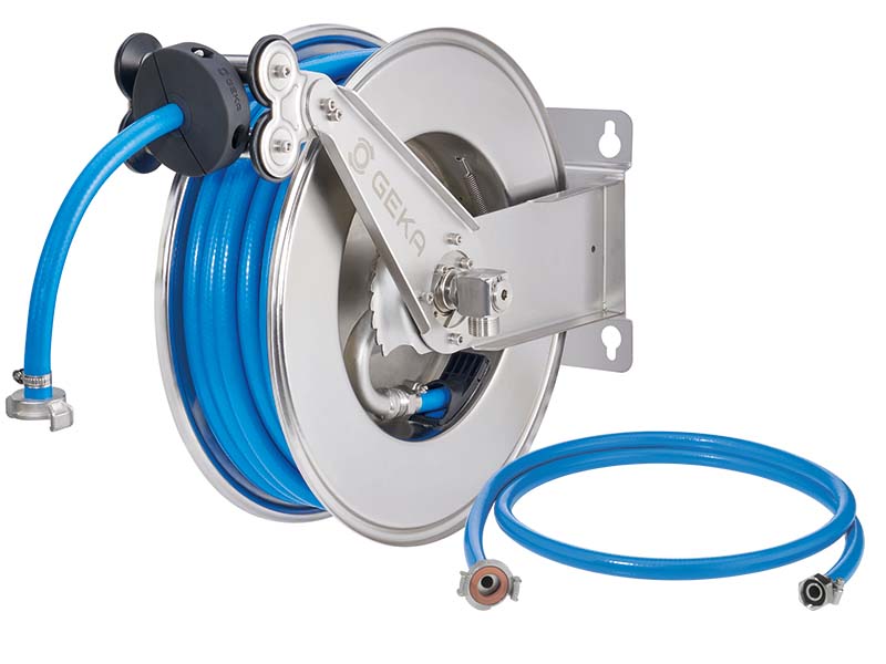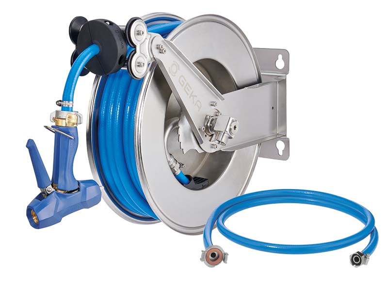 Automatyczne zwijadło naścienne wykonane ze stali szlachetnej, z wężem wielowarstwowym z PE z wkładkami z przędzy syntetycznej, oraz złączami kłowymi ze stali szlachetnej. Dostępne w zestawie z pistoletem do mycia.