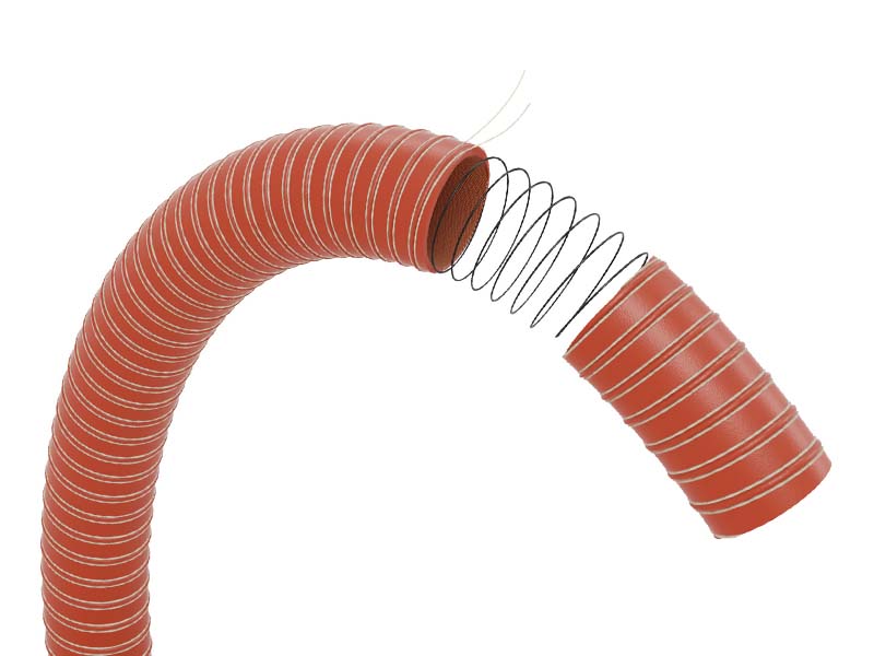 Wąż ESPIROSILICONE wykonano z gumy silikonowej pokrytej włóknem szklanym, ze spiralą ze stali ocynkowanej i wzmocnieniem z włókna.