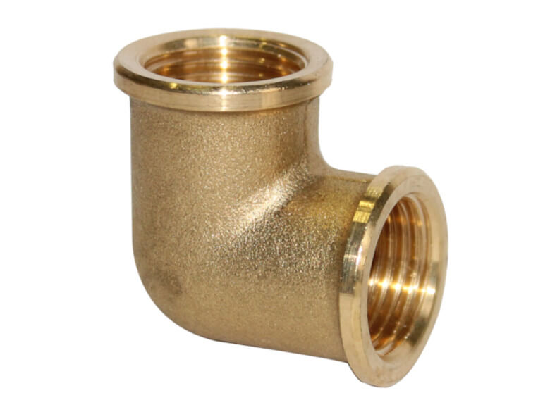 Kolano 90º z gwintami wewnętrznymi wykonane z mosiądzu.