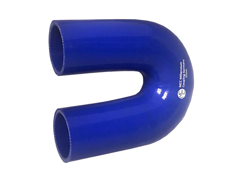 Silikonowy łącznik kątowy 180°, kolano zwrotne, U-kształtne, przeznaczone do konstrukcji instalacji chłodniczych w silnikach spalinowych. Element stosowany do transportu wody chłodniczej. Może pracować w otoczeniu wysokich temperatur występujących w układach chłodzenia, w ograniczonych przestrzeniach silników samochodowych, samogasnący.
