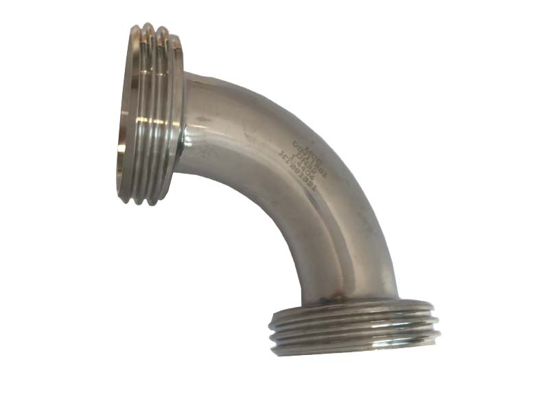 Kolano ze złączami mleczarskimi - przejściówka, skręcane, typ DIN 11851 męskie/męskie 90°, wykonane ze Stali Szlachetnej bez uszczelek.