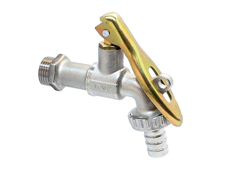Kulowy zawór czerpalny z możliwością blokady rączki, z gwintami zewnętrznymi i króćcem do węża z mosiądzu chromowanego.