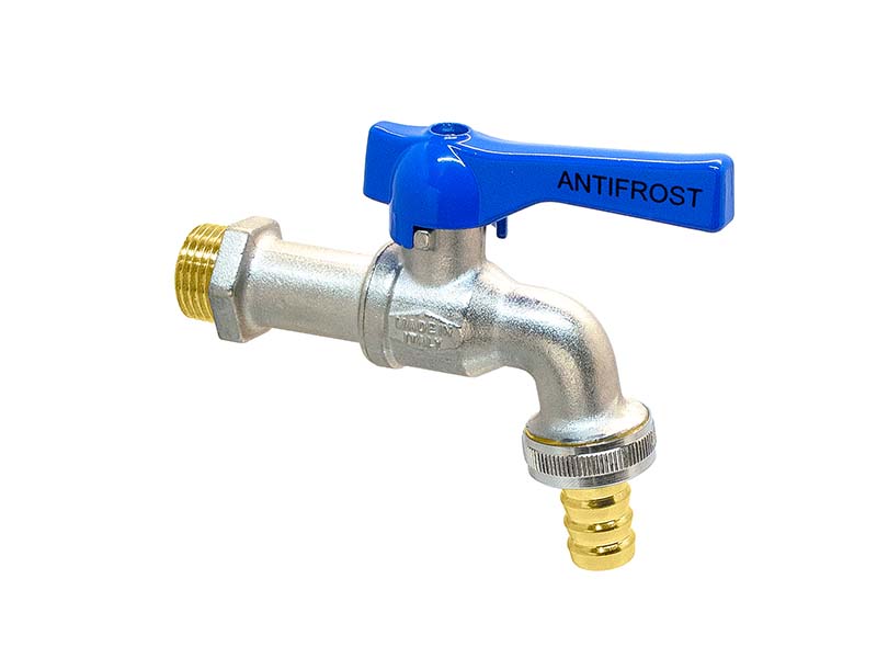 Kulowy zawór czerpalny "ANTIFROST" z gwintami zewnętrznymi z mosiądzu, z uszczelnieniem z PTFE, EPDM i NBR, z aluminiową rączką.