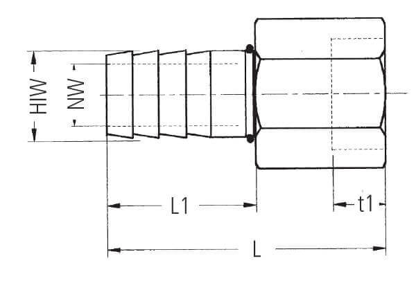 | rozmiar węża | gwint wewn. | rozmiar klucza | NW [mm] | t1 [mm] | L | L1 [mm] | nr id | nr artykułu |