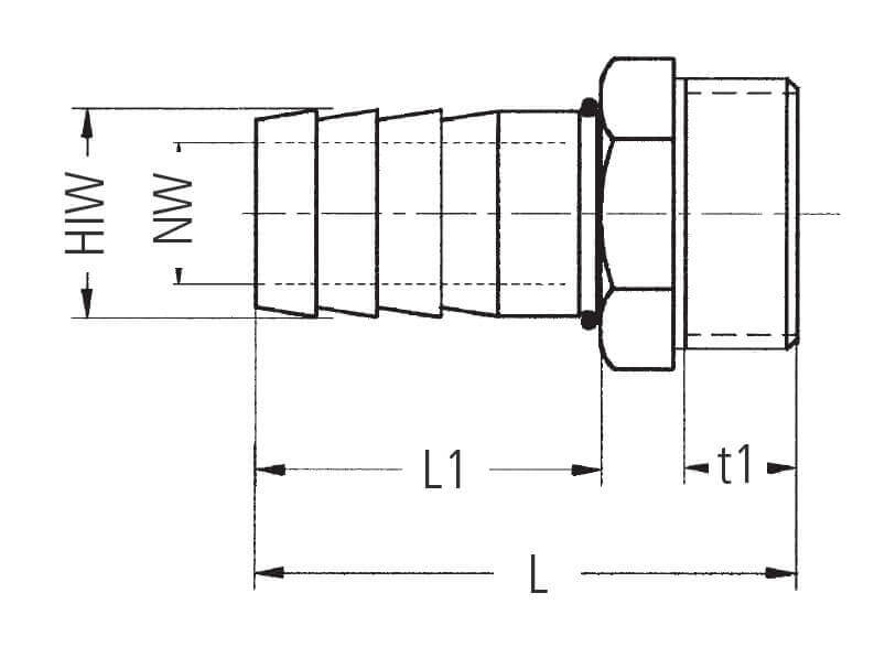 | gwint zewn. | rozmiar węża | rozmiar klucza | NW [mm] | t1 [mm] | L | L1 [mm] | nr id | nr artykułu |