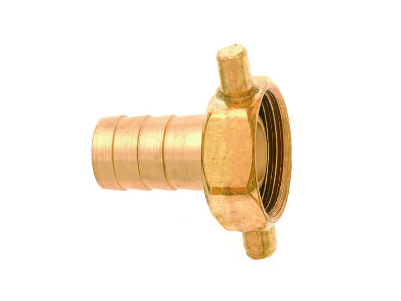 Króciec z nakrętką z gwintem wewnętrznym, do trzyczęściowych złączy GEKA 2 z 3 CH wykonany z mosiądzu, z uszczelnieniem z NBR.