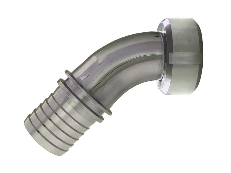 Króciec kątowy 45° do węży pod obejmę skorupową z gwintem wewnętrznym ISO 228 wykonany ze stali szlachetnej, uszczelnienie płaskie z PTFE.