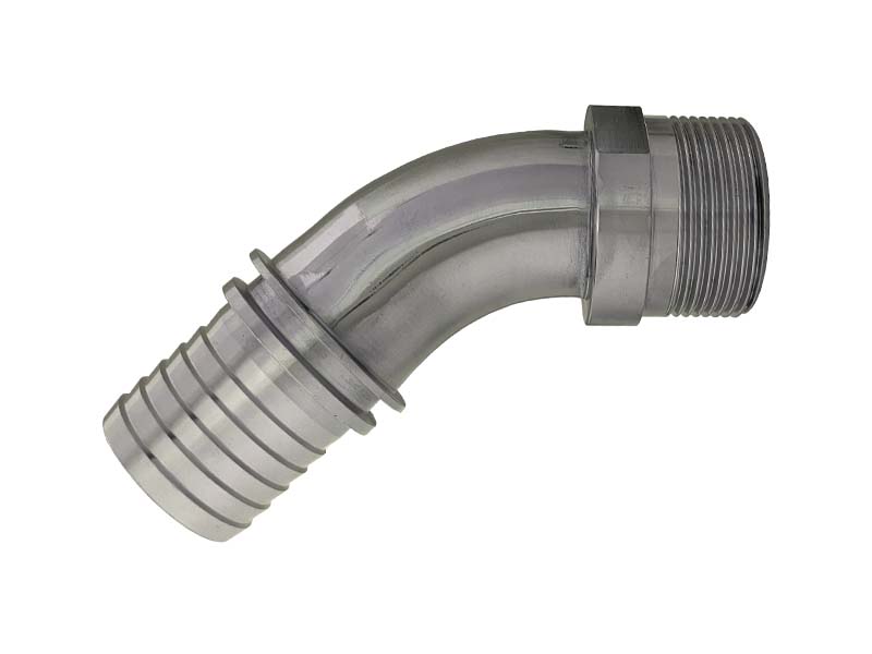 Króciec kątowy 45° do węży pod obejmę skorupową z gwintem zewnętrznym ISO 228 wykonany ze stali szlachetnej.