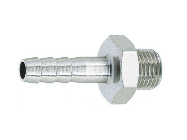 Króciec do węża z gwintem zewnętrznym wykonany z mosiądzu (MS 58) niklowanego.