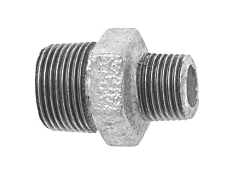 Redukcyjny nypel z gwintami zewnętrznymi "TG" wykonany z żeliwa galwanizowanego.