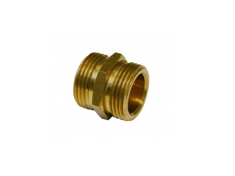 Nypel (łącznik) symetrycznyy z gwintami zewnętrznymi DIN ISO 228-1 (BSPP/G) wykonany z mosiądzu.