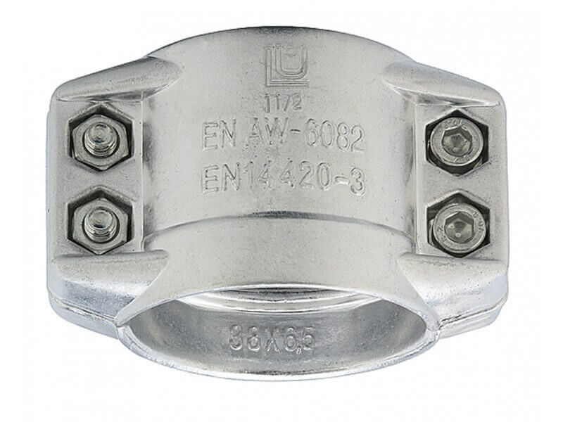 Obejma skorupowa z zaczepem bezpieczeństwa wykonana z Aluminium kutego.