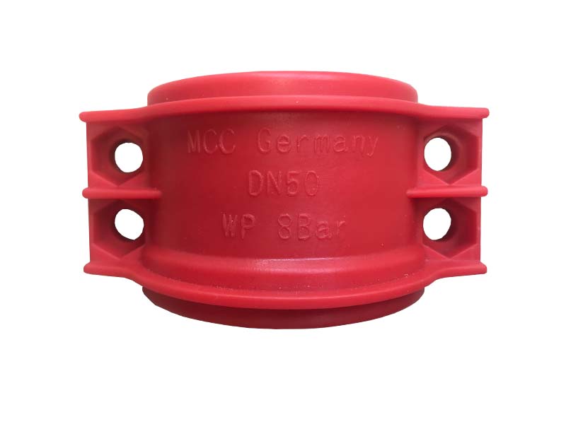 Obejma skorupowa z zaczepem bezpieczeństwa wykonana z Polipropylenu, czerwona, ze stalowymi śrubami.