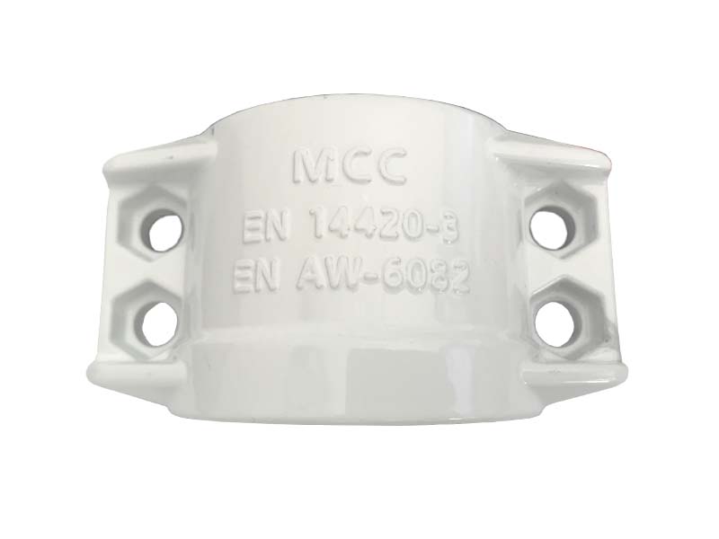 Obejma skorupowa z zaczepem bezpieczeństwa wykonana z Aluminium, pomalowana na biało, ze stalowymi śrubami.