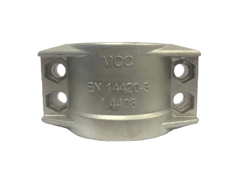 Obejma skorupowa z zaczepem bezpieczeństwa wykonana ze stali szlachetnej, z śrubami również ze stali szlachetnej.