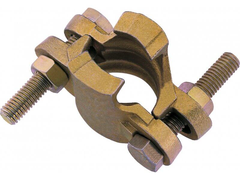 Obejma z dociskiem bocznym i zaczepami bezpieczeństwa wykonana z żeliwa ciągliwego.