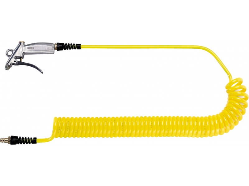 Spiralny wąż typu MODY z szybko-rozłączalnym nyplem wtykowym DN 7,2 na krótkim odejściu (10cm) i pneumatycznym pistoletem na długim odejściu (50cm). Zapewnia doskonałą elastyczność i giętkość. Zabezpieczenie z tworzywa sztucznego chroniące przez załamaniem i zadrapaniem.