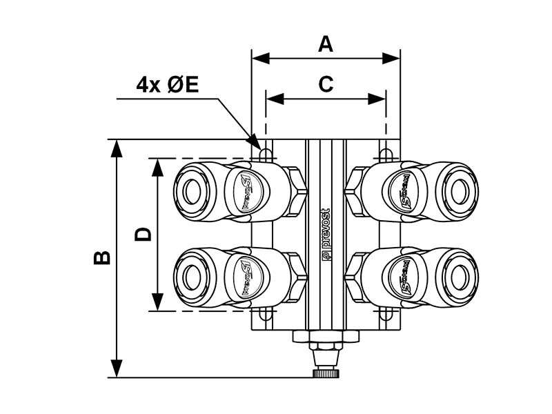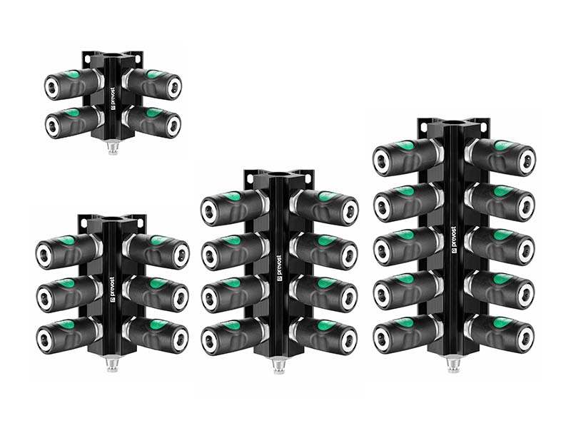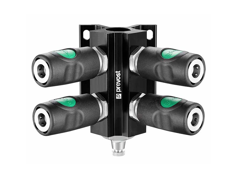 Uchwyty przeznaczone sa do zastosowania jako punkty dostępowe przy budowie instalacji pneumatycznych. Zaprojektowane z myślą o współpracy z szybkozłączkami PREVOST, z serii PrevoS1. Szybkozłączki z tej serii przeznaczone są przede wszystkim do transportu sprężonego powietrza w systemach pneumatycznych. Uchwyt posiada wejście od góry z gwintem wewnętrzym BSPP i parzystą ilość portów i szybkozłączek na wyjściu. Szybkozłączki z tej serii, niezależnie od rozmiaru i profilu wtyku są jednocześnie zaworami jednostronnie odcinającymi, co zapobiega wydostawaniu się medium w przypadku rozpięcia przewodu i nie wymaga dodatkowego zaworu zamykającego instalacje w celu jej rozpięcia. Rozdzielacze wyposażone są w manualne systemy spustu. Wszystkie szybkozłączki są fabrycznie zamontowane, w rozmiarze DN 7,4.