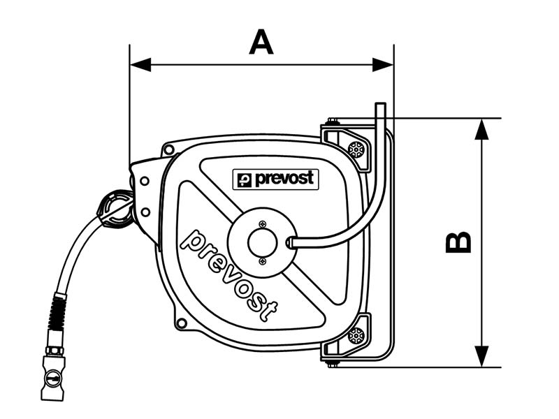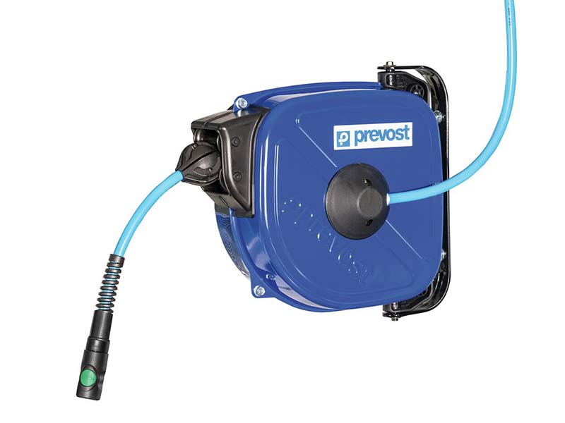 Bardzo solidne, metalowe zwijadło do transportu powietrza w narzędziach zasilanych pneumatycznie, wyposażone w przewody z szybkozłączkami PrevoS1 odpornymi na mgiełkę olejową. Zamontowane szybkozłączki z ESI 07 o rozmiarze DN 7,4 przeznaczone są przede wszystkim do transportu sprężonego powietrza w systemach pneumatycznych. Złącze to jest jednocześnie zaworem jednostronnie odcinającym, co zapobiega wydostawaniu się medium w przypadku rozpięcia przewodu i nie wymaga dodatkowego zaworu zamykającego instalacje w celu jej rozpięcia.