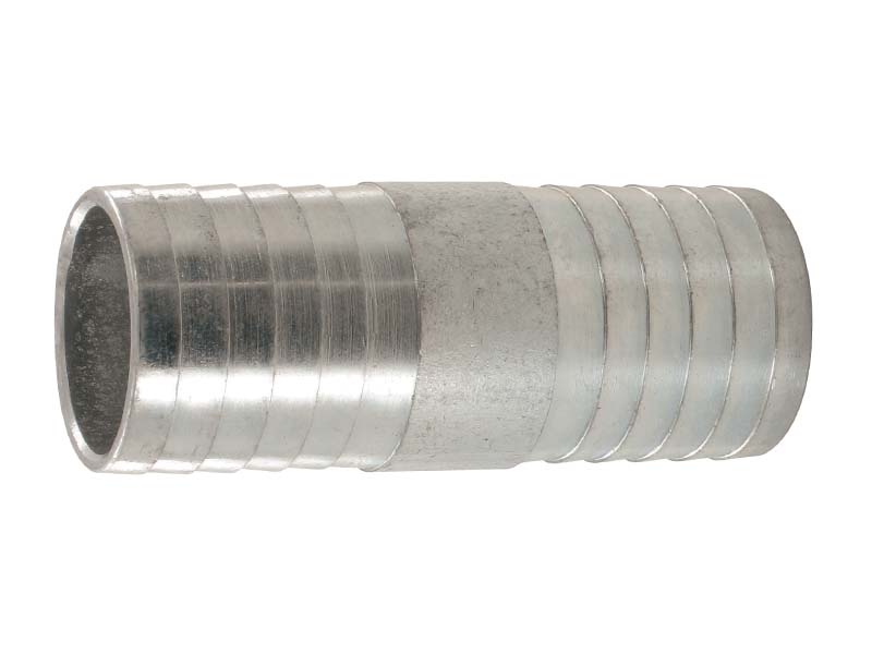 Symetryczny króciec do węży, łącznik wykonany ze stali szlachetnej posiada profil króćca z łagodnym żebrowaniem, choinką, dostosowaną do montażu z opaskami, w celu zmniejszenia ryzyka uszkodzenia węża podczas pracy i montażu. Przewidziany do aplikacji wymagających dużego obciążenia pracą. Takich elementów używa się w celu połączenia ze sobą dwóch zbyt krótkich węży, które często produkowane są w określonych długościach, bądź też w celu naprawy uszkodzonych mechanicznie węży.