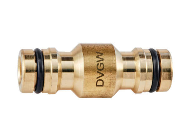 Wtyk symetryczny szybkozłączki GEKA® Plus "drinking water". Element ten posiada po obu stronach stronie wtyk szybkozłączki, zgodny z profilem wtyku popularnych szybkozłączek ogrodowych. Ponieważ w systemie szybkozłączek GEKA PLUS "push-fit" nie ma figury z wtykiem montowanym bezpośrednio na wąż, aby połączyć ze sobą dwa przewody, należy użyć symetrycznego łącznika. Element najczęściej używany jest do przedłużania dwóch przewodów wyposażonych w gniazda szybkozłączek.