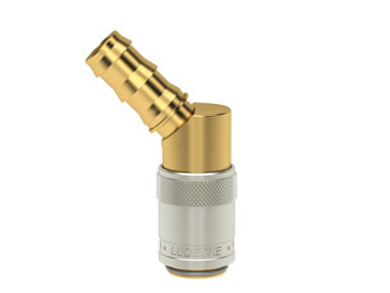 Gniazdo szybkozłączki z króćcem do węża, wykonane z mosiądzu (MS 58), z elementami ze stali szlachetnej, mosiądzu niklowanego i uszczelnieniem z gumy fluorowej (FKM).