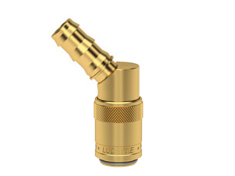 Gniazdo szybkozłączki z króćcem do węża, wykonane z mosiądzu (MS 58), z elementami ze stali szlachetnej i uszczelnieniem z gumy fluorowej (FKM).