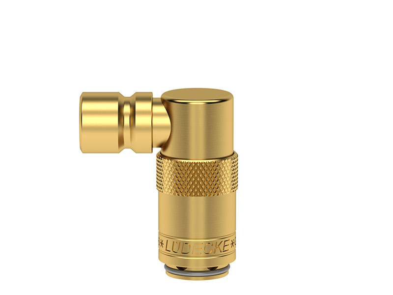 Adapter z gniazdem i wtykiem szybkozłączki, wykonany z mosiądzu (MS 58), z elementami ze stali szlachetnej i uszczelnieniem z gumy fluorowej (FKM).