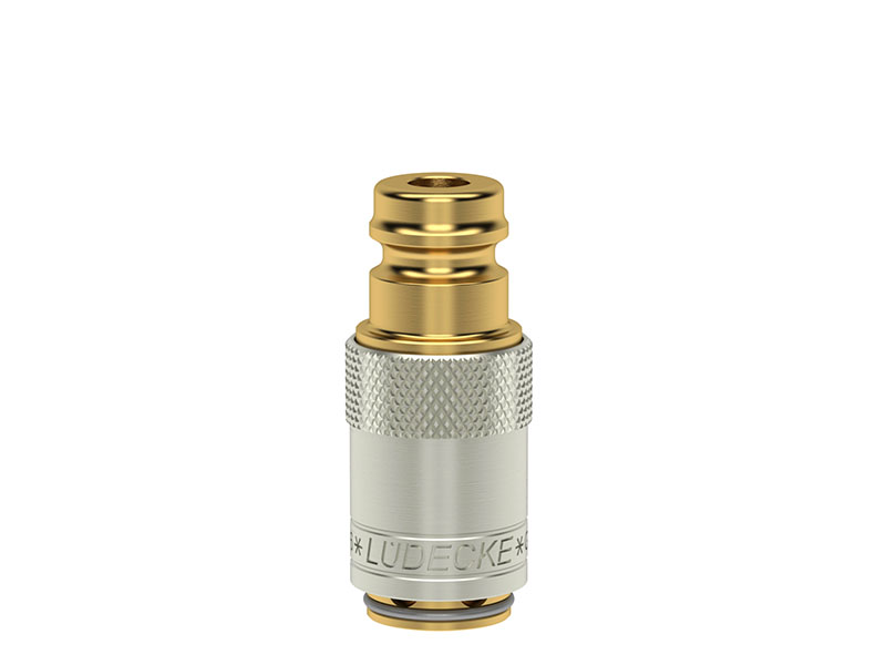 Adapter z gniazdem i wtykiem szybkozłączki, wykonany z mosiądzu (MS 58) niklowanego, z elementami ze stali szlachetnej i uszczelnieniem z gumy fluorowej (FKM).