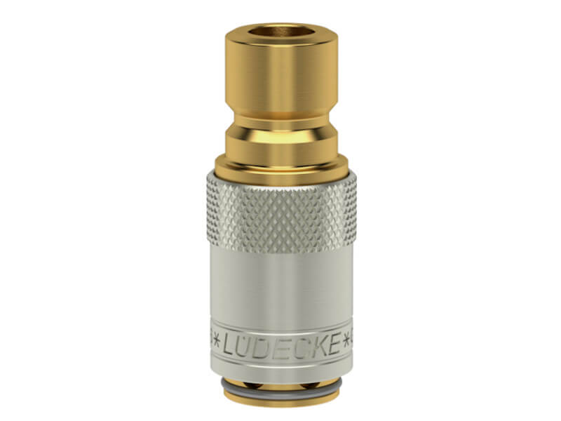 Adapter z gniazdem i wtykiem szybkozłączki, wykonany z mosiądzu (MS 58) niklowanego, z elementami ze stali szlachetnej i uszczelnieniem z gumy fluorowej (FKM).
