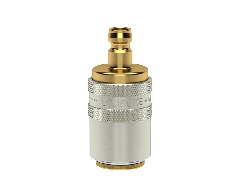 Adapter z gniazdem i wtykiem szybkozłączki, wykonany z mosiądzu (MS 58), z elementami ze stali szlachetnej, mosiądzu niklowanego i uszczelnieniem z gumy fluorowej (FKM).