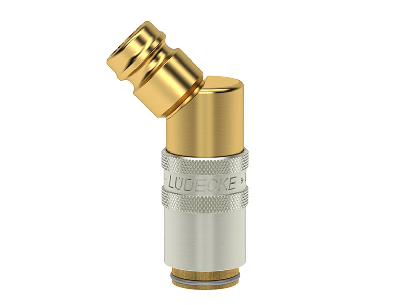 Adapter z gniazdem i wtykiem szybkozłączki, wykonany z mosiądzu (MS 58) niklowanego, z elementami ze stali szlachetnej i uszczelnieniem z gumy fluorowej (FKM).