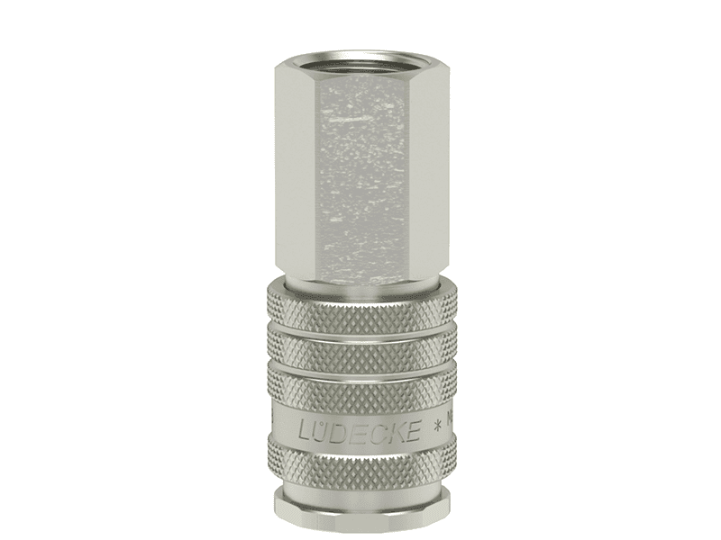 Gniazdo szybkozłączki bez zaworu, z gwintem wewnętrznym, wykonane z mosiądzu (MS 58) niklowanego, z elementami ze stali szlachetnej i uszczelnieniem z gumy nitrylowej (NBR).