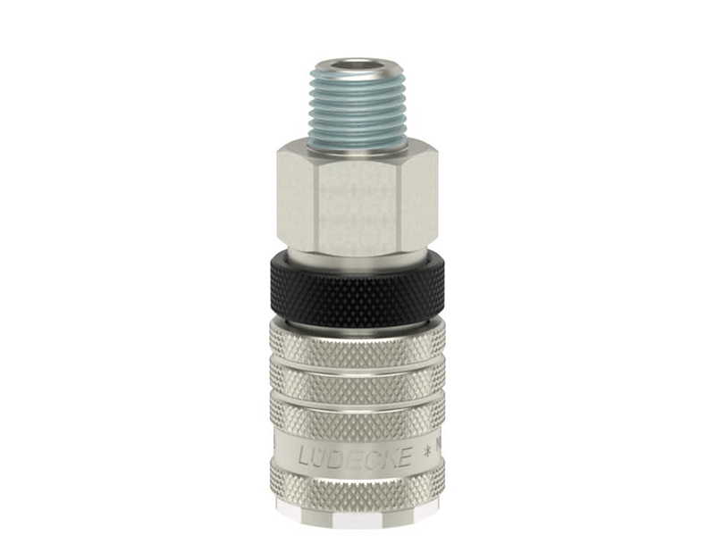 Gniazdo szybkozłączki jednostronnie odcinającej z gwintem zewnętrznym, wykonane z mosiądzu (MS 58) niklowanego, z elementami ze stali szlachetnej i uszczelnieniem z gumy nitrylowej (NBR).