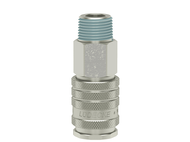 Gniazdo szybkozłączki jednostronnie odcinającej z powlekanym gwintem zewnętrznym, wykonane z mosiądzu (MS 58) niklowanego, z elementami ze stali szlachetnej i uszczelnieniem z gumy nitrylowej (NBR).