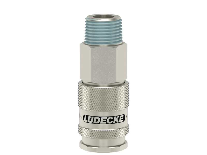 Gniazdo szybkozłączki jednostronnie odcinającej z powlekanym gwintem zewnętrznym, wykonane z mosiądzu (MS 58) niklowanego, z elementami ze stali szlachetnej i uszczelnieniem z gumy nitrylowej (NBR).