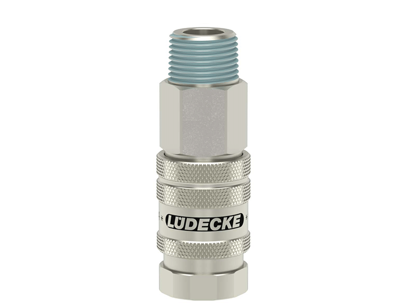 Gniazdo szybkozłączki jednostronnie odcinającej z powlekanym gwintem zewnętrznym, wykonane z mosiądzu (MS 58) niklowanego, z elementami ze stali szlachetnej i uszczelnieniem z gumy nitrylowej (NBR).
