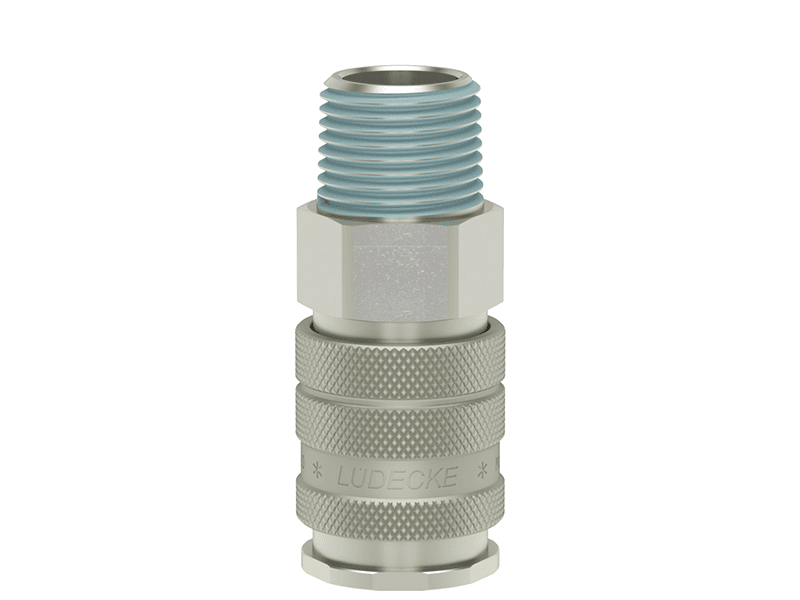 Gniazdo szybkozłączki jednostronnie odcinającej z powlekanym gwintem zewnętrznym, wykonane z mosiądzu (MS 58) niklowanego, z elementami ze stali szlachetnej, stali hartowanej i uszczelnieniem z gumy nitrylowej (NBR).