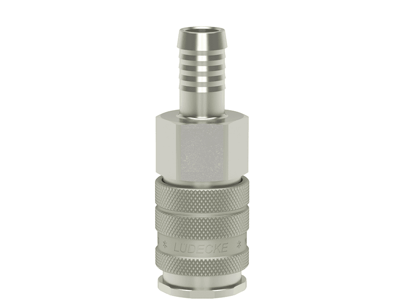 Gniazdo szybkozłączki jednostronnie odcinającej z króćcem do węża, wykonane z mosiądzu (MS 58) niklowanego, z elementami ze stali szlachetnej, stali hartowanej i uszczelnieniem z gumy nitrylowej (NBR).