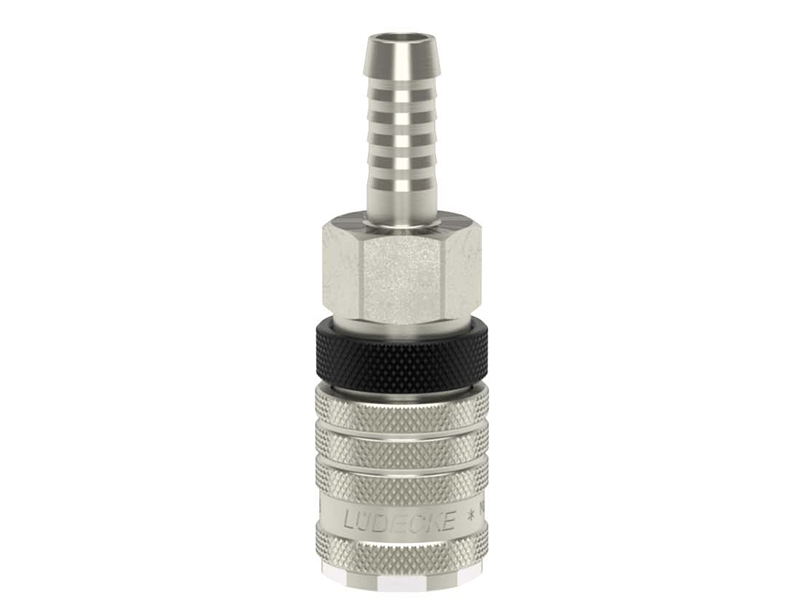 Gniazdo szybkozłączki jednostronnie odcinającej z króćcem do węża, wykonane z mosiądzu (MS 58) niklowanego, z elementami ze stali szlachetnej i uszczelnieniem z gumy nitrylowej (NBR).