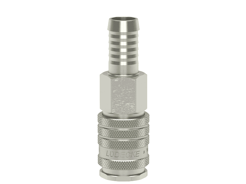 Gniazdo szybkozłączki bez zaworu z króćcem do węża, wykonane z mosiądzu (MS 58) niklowanego, z elementami ze stali szlachetnej i uszczelnieniem z gumy nitrylowej (NBR).