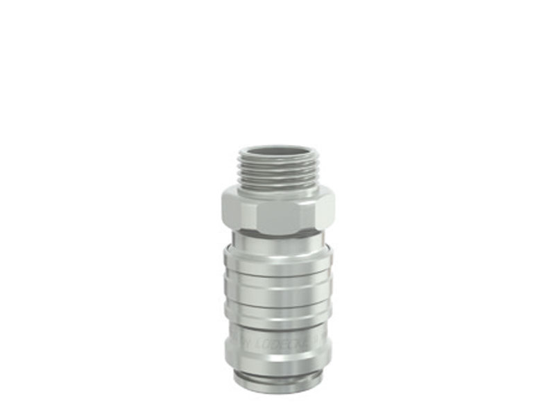 Gniazdo szybkozłącza z gwintem zewnętrznym wykonane z mosiądzu (MS 58) niklowanego, z elementami ze stali szlachetnej i uszczelnieniem z gumy nitrylowej (NBR).