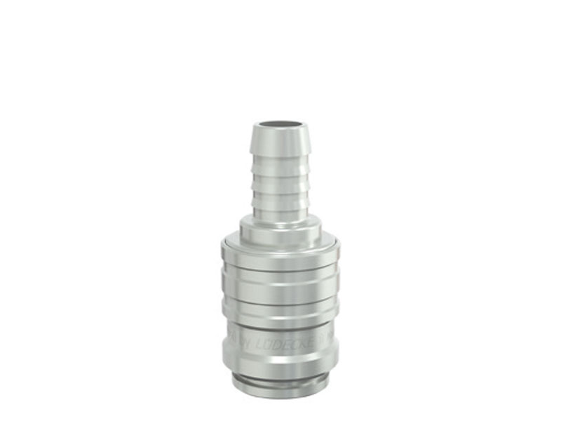 Gniazdo szybkozłącza z króćcem do węża wykonane z mosiądzu (MS 58) niklowanego, z elementami ze stali szlachetnej i uszczelnieniem z gumy nitrylowej (NBR).