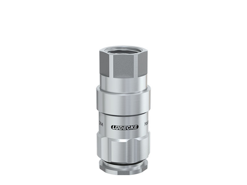 Gniazdo szybkozłączki z gwintem wewnętrznym, wykonane ze stali szlachetnej i uszczelnieniem z gumy fluorowej (FKM).