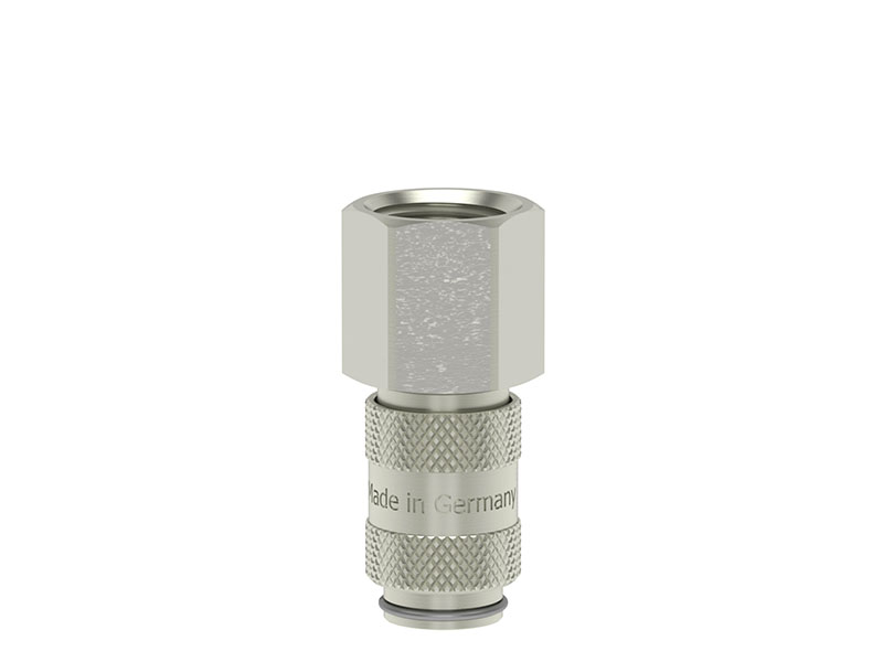 Gniazdo szybkozłącza jednostronnie odcinającego z gwintem wewnętrznym wykonane z mosiądzu (MS 58) niklowanego, z elementami ze stali szlachetnej i uszczelnieniem z gumy nitrylowej (NBR).